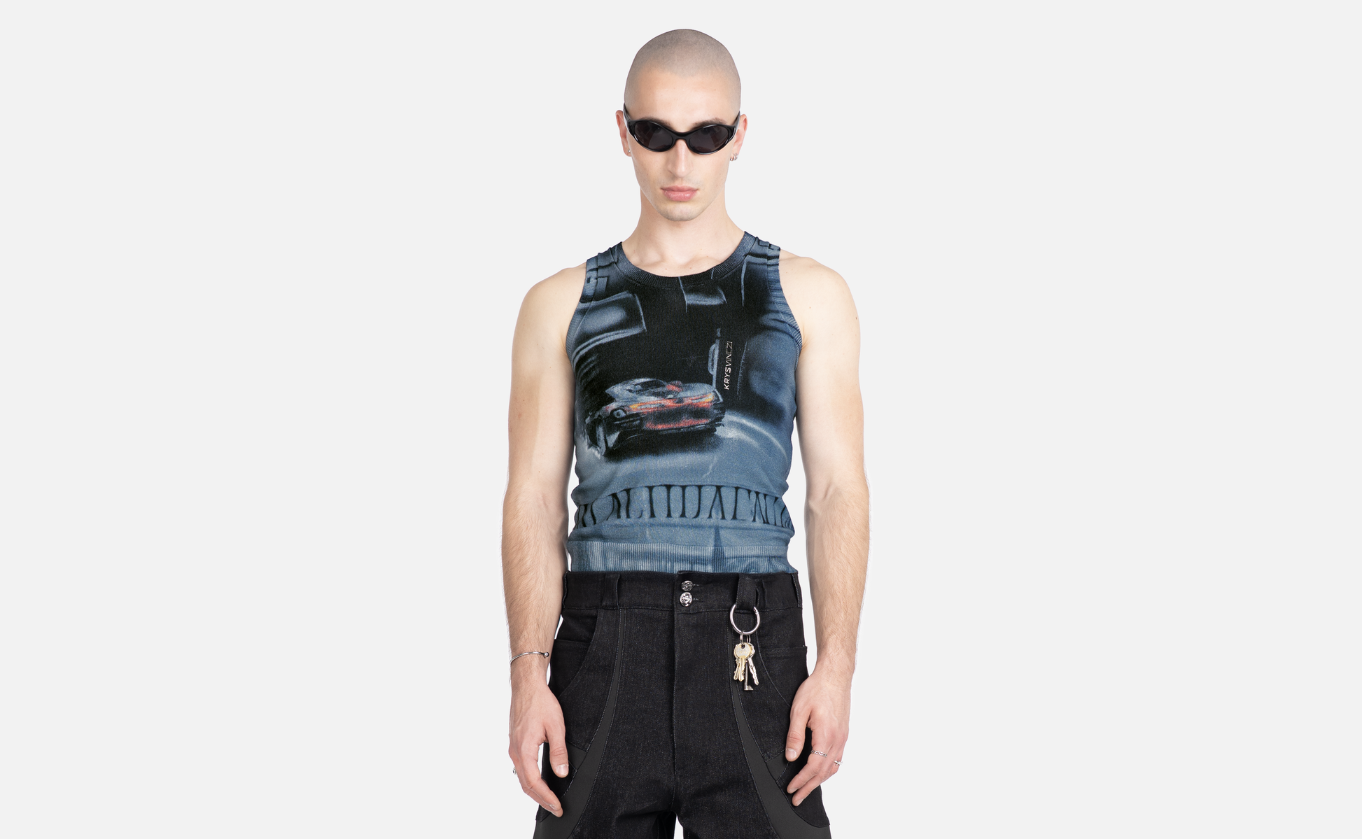 Slim-fit knitwear tank top crafted from 100% soft organic cotton, featuring a high-definition digital print of an imagined sports car on a charging station. The design combines an nostalgic graphic feel with a tech-inspired aesthetic, finished with a gunmetal TPU logo.