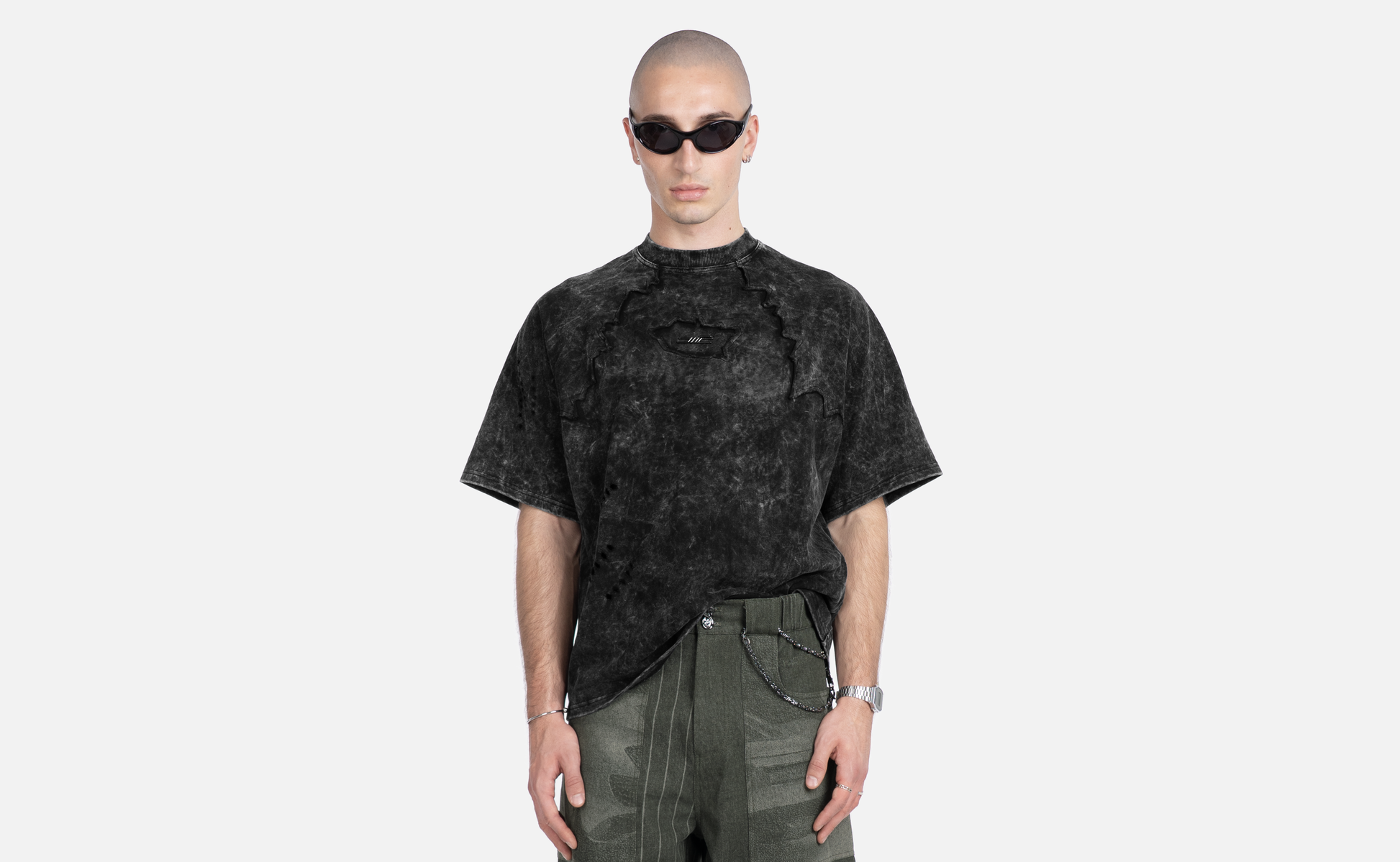 Acid-washed T-shirt with a deconstructed, distressed design. Made from 100% cotton, the acid-wash finish creates unique tonal variations on each piece. The chest is accented with a gunmetal logo, adding a metallic detail that contrasts with the shirt’s raw, organic texture.