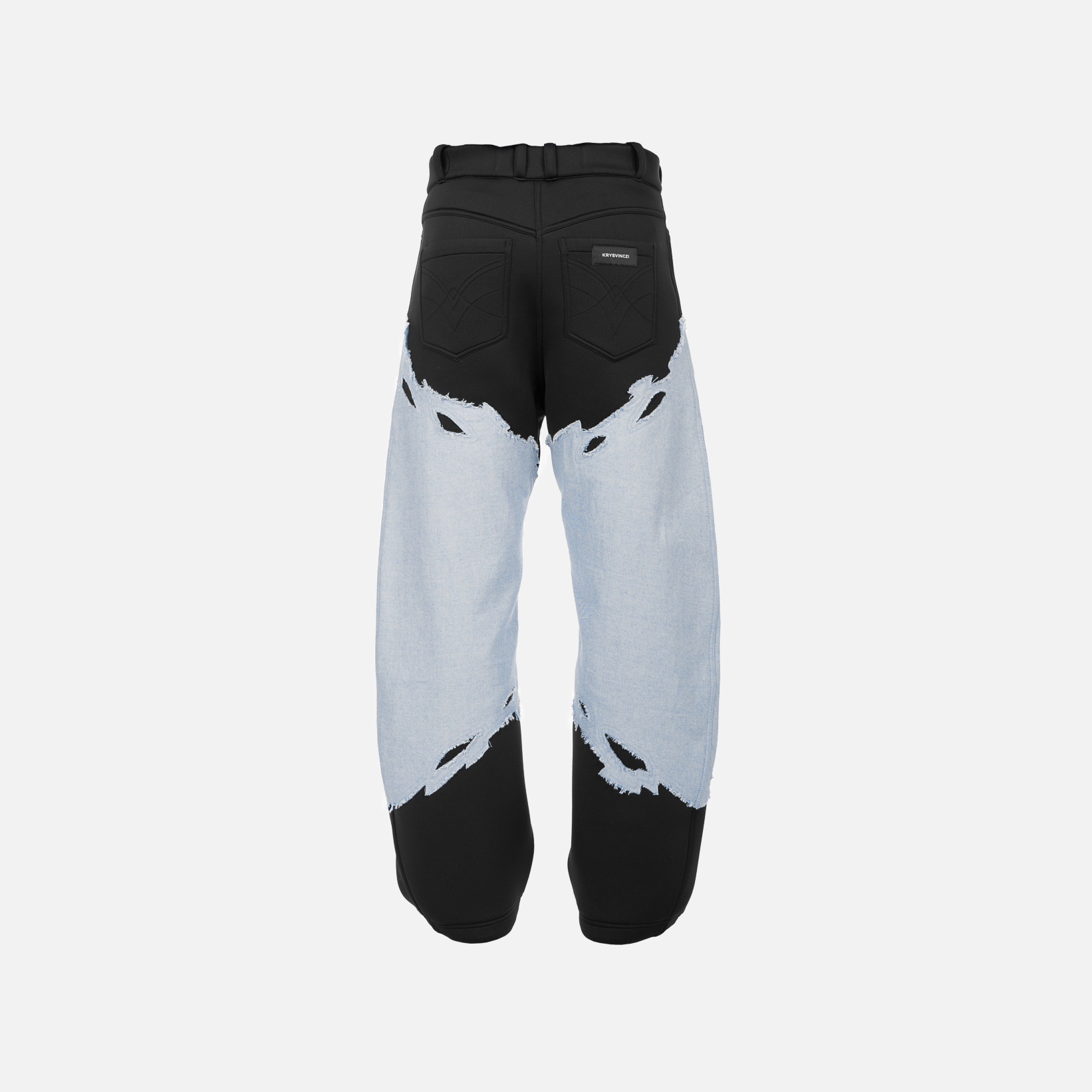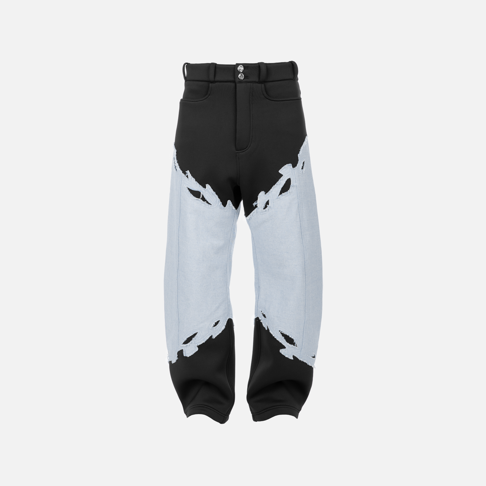 Relaxed denim pants fit with a performance scuba fabric. Abstract, blade-like accent in washed, light-blue denim. Made from 340g structured yet comfortable denim.