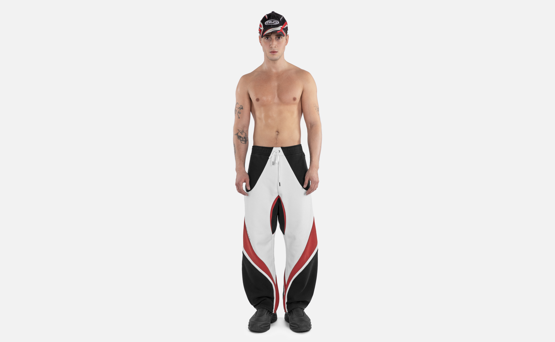 Black textured denim cap, adorned with black, red and off-white all-over abstract formations in refined tatami embroidery for a textured, contemporary finish.