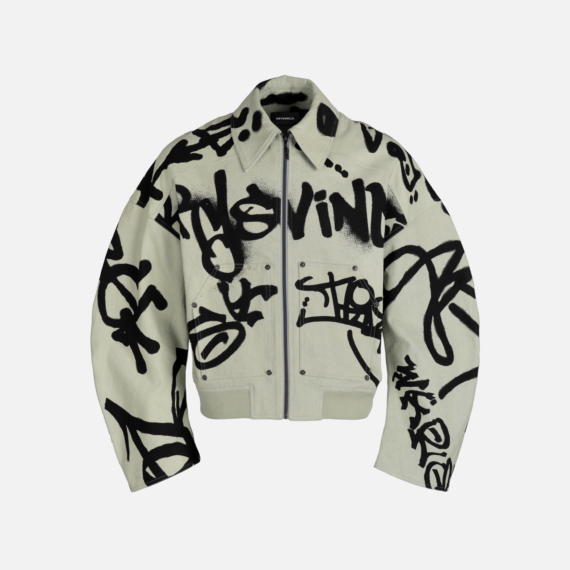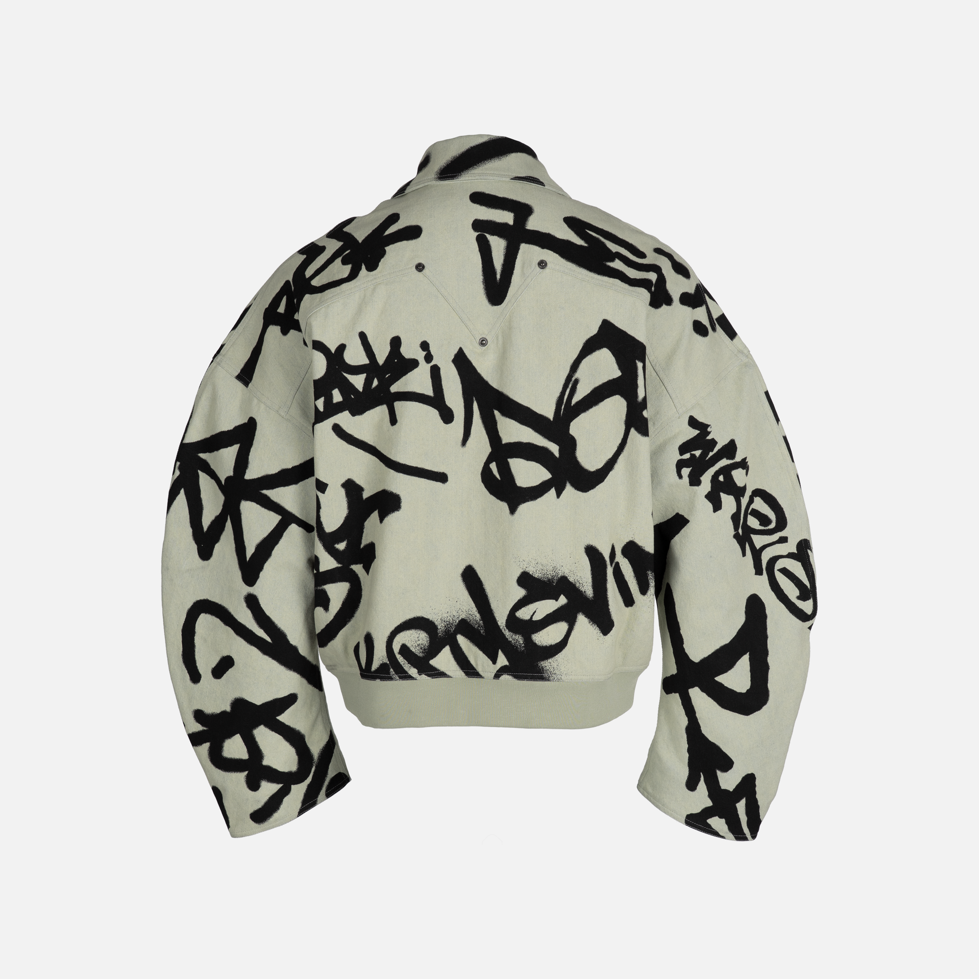 A reinterpreted workwear classic elevated through structure and detail. Crafted from heavyweight blue-green tinted beige denim, with a sculpted sleeve silhouette and reinforced seams. The piece features a all-over graffiti print. Made from 340g structured yet comfortable denim.