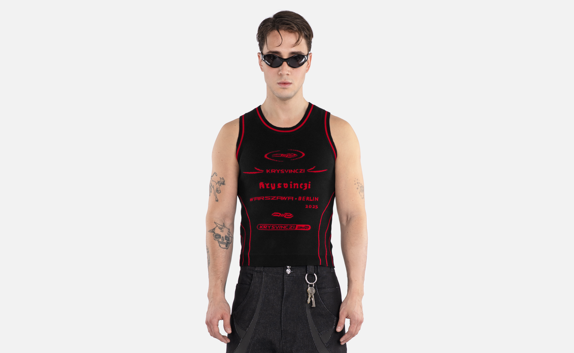 A sleeveless statement engineered for intensity. Knitted cotton in black with red promotional style logo variations. The form-hugging rib structure contours the body while maintaining stretch and resilience.