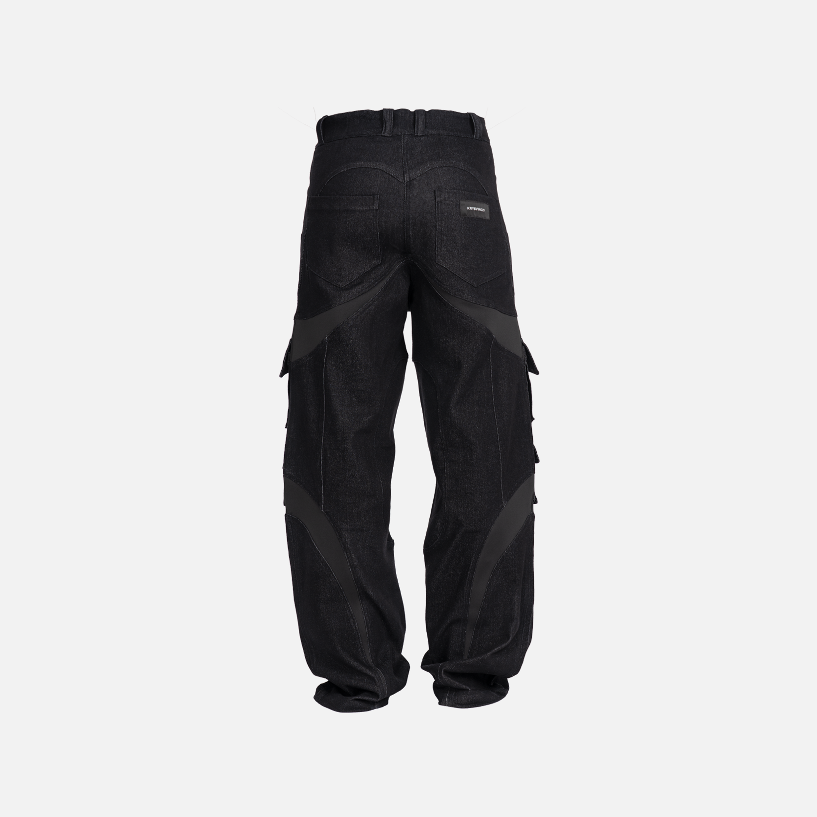 Relaxed black denim pants crafted from 340g structured yet comfortable denim, enhanced with graphic scuba formations. Tailored back and finished with signature Krysvinczi hardware and embroidery tag.