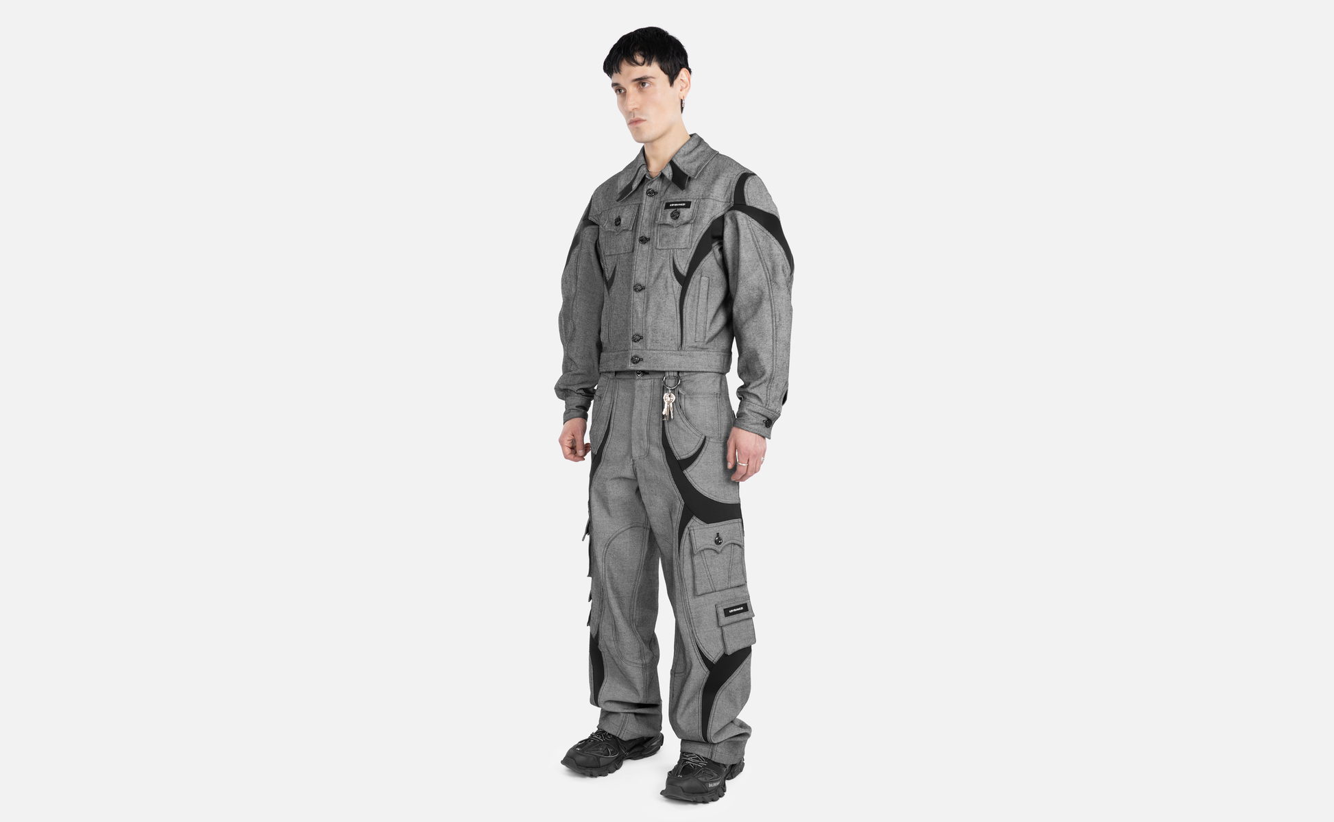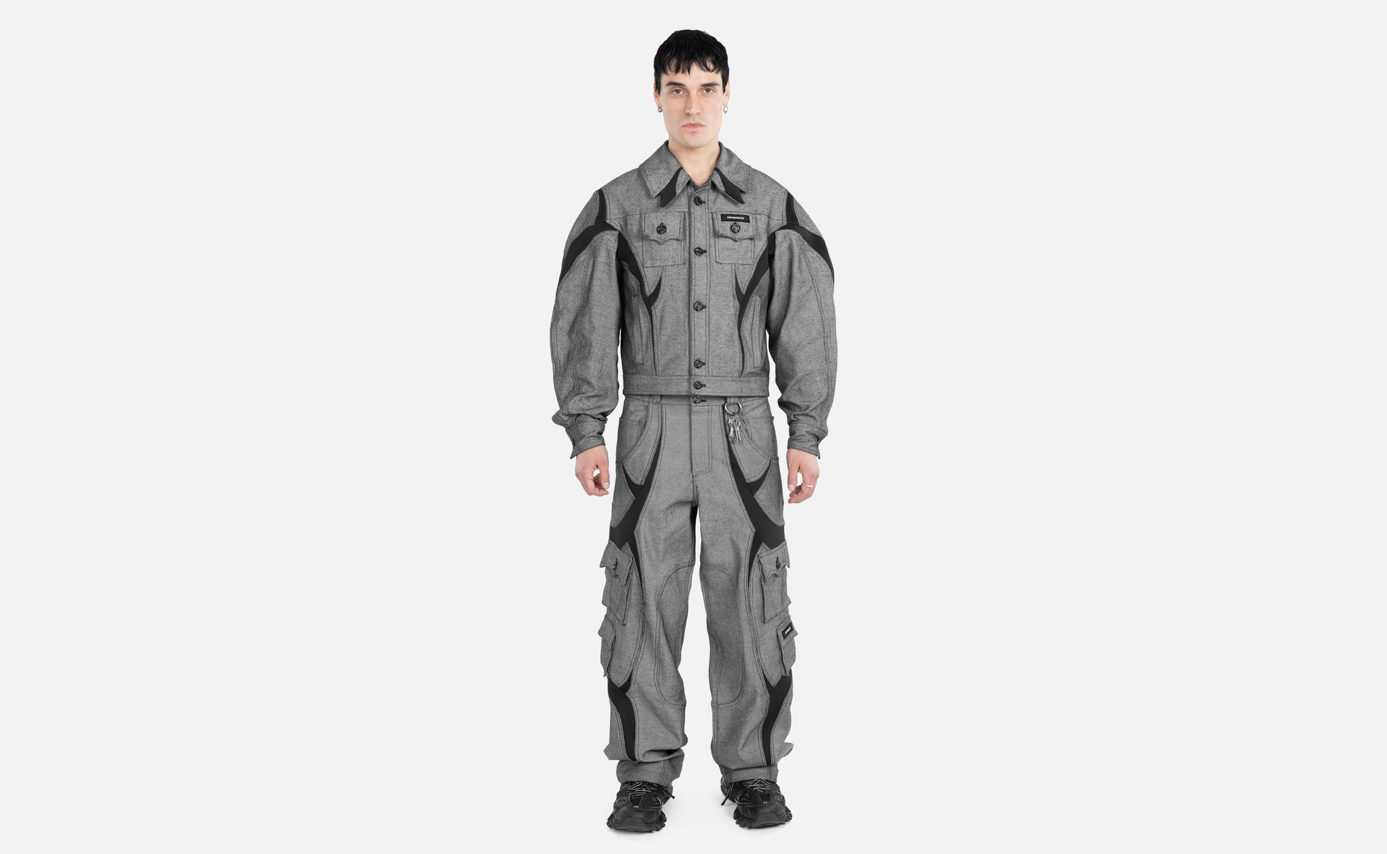 Relaxed grey textured denim pants crafted from 340g structured yet comfortable denim, enhanced with graphic scuba formations. Tailored back and finished with signature Krysvinczi hardware and embroidery tag.